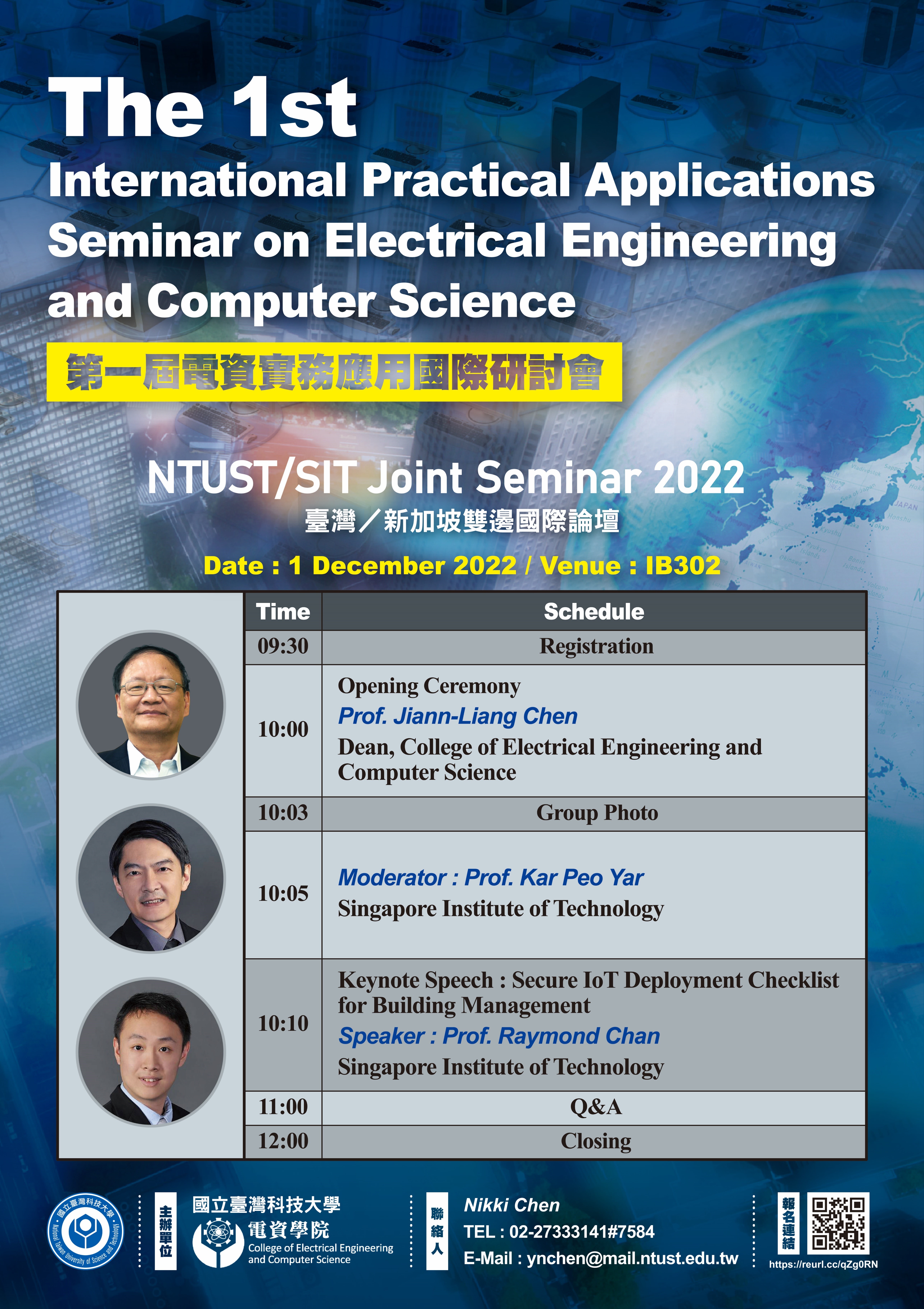 電資學院即將於12/1(四)舉辦第一屆電資實務應用國際研討會 /NTUST -SIT Joint Seminar 2022 臺灣/新加坡雙邊國際論壇,本次研討會特邀請新加坡理工大學教授演講,歡迎同學院踴躍報名參加!