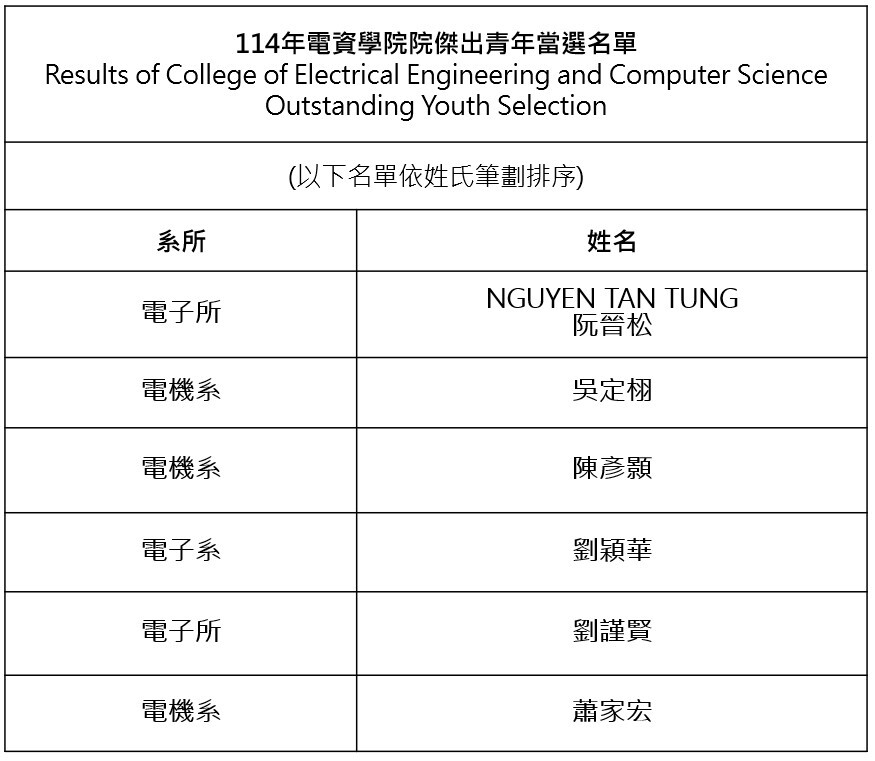 114年電資學院傑出青年甄選結果(Results of the 2025 Outstanding Youth Selection)